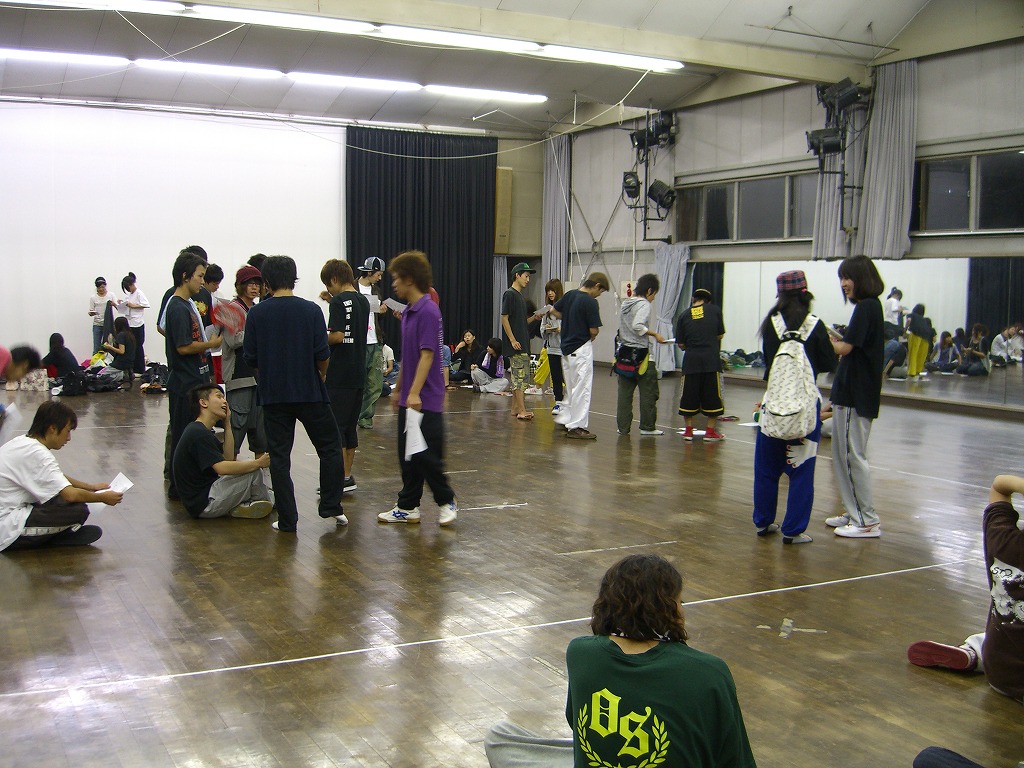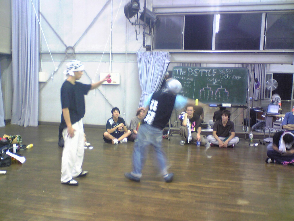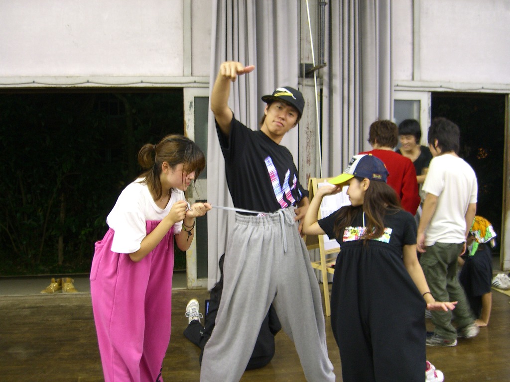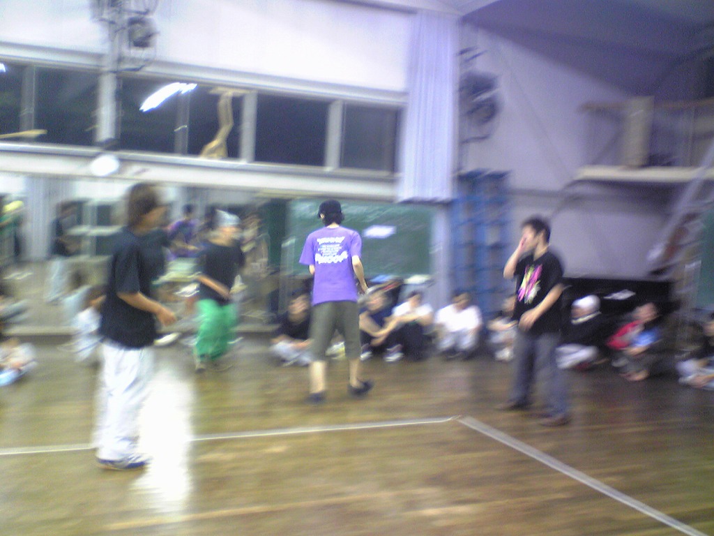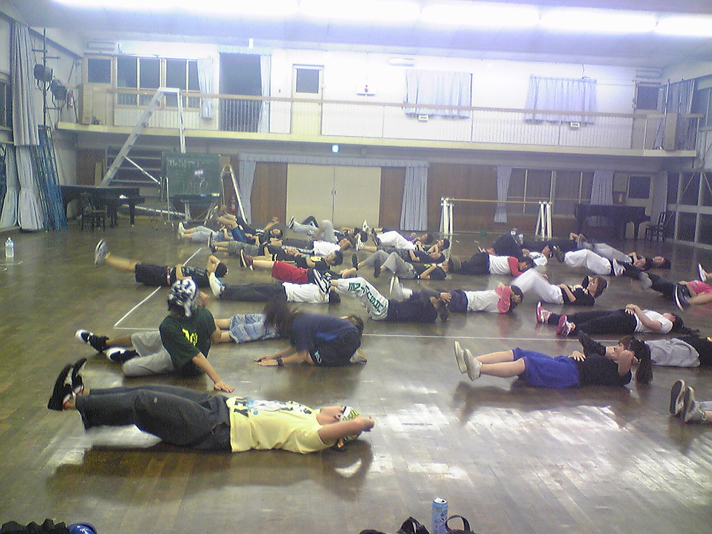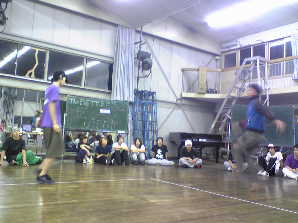 「夏合宿レポはまだ?」は禁句です。 9月中にできればいいペースなので、ちょっと待ってください(泣) 写真のほうは、4年ちゃあさん、2年えりなからいただきましたので、 しっかり使わせていただきます!ありがとうございました。 「もう秋ですね」と前回のタイトルで秋が来たね的雰囲気が漂っていますが、 そんなのは関係ない。 舞踊場はまだまだ熱気を帯びています☆ 「レッスン→4年さっきぃさんによるバトル」の流れが定着する今、 帰省していた方々も帰って来ていますので、 たくさんの人であふれています♪ さっそくレッスン、バトルの様子を見てみましょう。 左から 4年のみねさん、やまたくさん、3年のなおちかさん。 難しめの長い振りでした。 やはりこの3人が前で踊ると沸きますね♪ そしてバトルの様子・・・ ?この光景、どこかで見た気が・・・ 確か以前のバトルでもこの2人のバトルが見られましたよね☆ どうやら「バトル」ともなると舞踊場にいる人の目線もそちらに向くようです。 そのバトルを盛り上げるのが観客!! 大事なのはバトルを見てそれに応じた反応でもあるんですね。 時間のあるかたどんどんバトルを見学しに行きましょう♪ 参加者の方もモチベーションがあがりますからね。 多々撮れていないレッスンやバトルがあってすみません(汗) 全部は難しいですが、なるべくとるようにしますので、 ご了承くださいm(_ _)m 4年しげさんと2年はじくんによる振り見せ。 前段階の練習のフリが多く入っていたとはいえ、 やっぱり難しかったですね(汗) 決勝戦の「2年ゆーすけ VS 4年ロッキーさん」の前の、 エキシビジョンマッチ2on2!!! これはアツすぎる!! しどうさんのshort move→しげさん→しんさん →しどうさん→じゅんぺいさんという流れ。 会場は大盛り上がりでした★ 2年生ゆーすけ! もりあがりを見せた観客の方々にも拍手を。 両者すばらしいムーブでした。 と、まあまだまだ熱気のさめやらない舞踊場。 みなさんもぜひ、足を運んでみてくださいね☆ 次は早いことに学祭公演です! チームも動き出しますし、いろいろ事務的な伝達も増えてきます。 BBSやメーリスを通して確認するのも良いですが、 やはり直接来て確認するようにしてください。 それではこれから寒くなってきますが、 頑張ってアツくしてやりましょう!!!