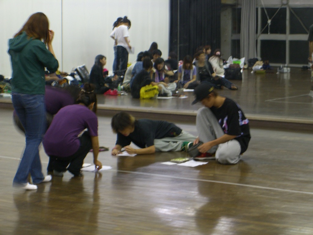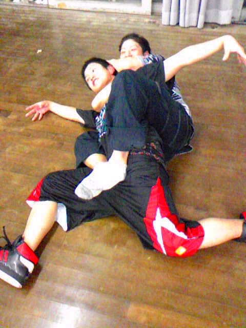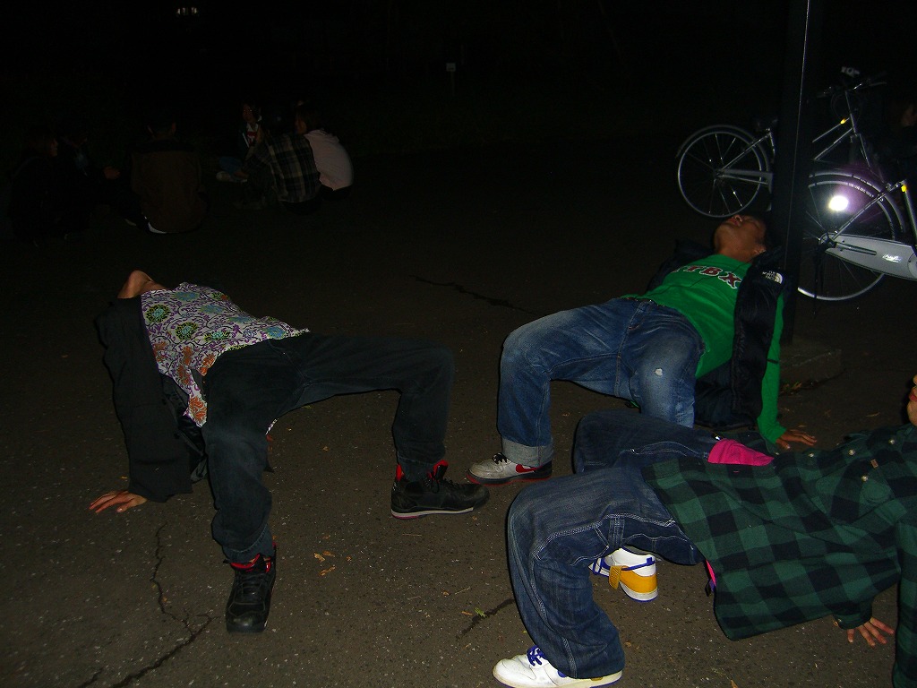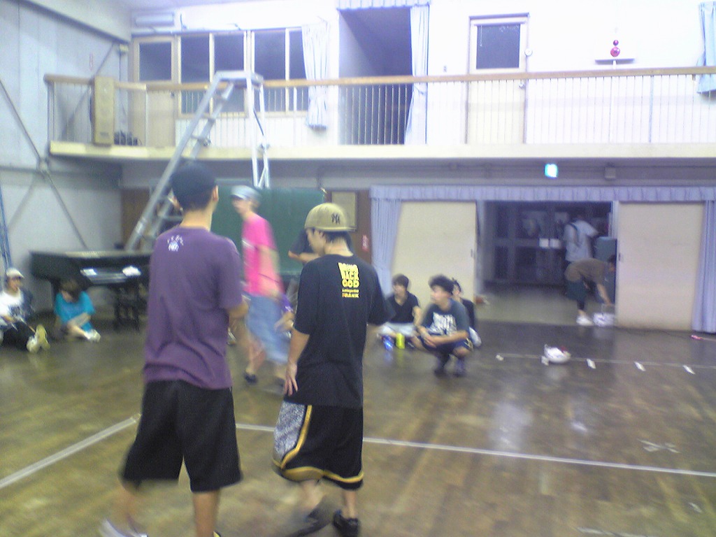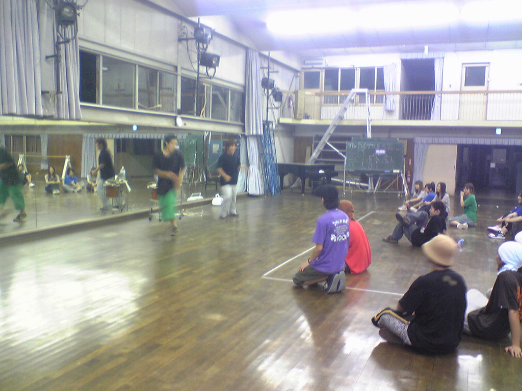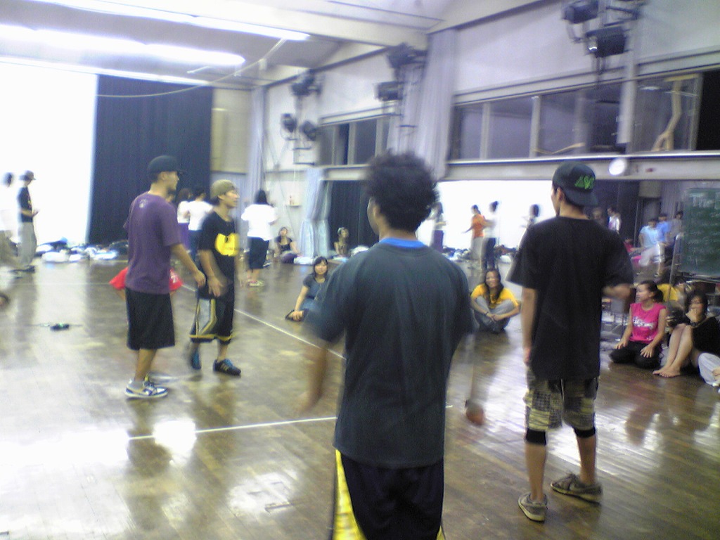 「夏合宿レポはまだ?」は禁句です。 9月中にできればいいペースなので、ちょっと待ってください(泣) 写真のほうは、4年ちゃあさん、2年えりなからいただきましたので、 しっかり使わせていただきます!ありがとうございました。 「もう秋ですね」と前回のタイトルで秋が来たね的雰囲気が漂っていますが、 そんなのは関係ない。 舞踊場はまだまだ熱気を帯びています☆ 「レッスン→4年さっきぃさんによるバトル」の流れが定着する今、 帰省していた方々も帰って来ていますので、 たくさんの人であふれています♪ さっそくレッスン、バトルの様子を見てみましょう。 左から 4年のみねさん、やまたくさん、3年のなおちかさん。 難しめの長い振りでした。 やはりこの3人が前で踊ると沸きますね♪ そしてバトルの様子・・・ ?この光景、どこかで見た気が・・・ 確か以前のバトルでもこの2人のバトルが見られましたよね☆ どうやら「バトル」ともなると舞踊場にいる人の目線もそちらに向くようです。 そのバトルを盛り上げるのが観客!! 大事なのはバトルを見てそれに応じた反応でもあるんですね。 時間のあるかたどんどんバトルを見学しに行きましょう♪ 参加者の方もモチベーションがあがりますからね。 多々撮れていないレッスンやバトルがあってすみません(汗) 全部は難しいですが、なるべくとるようにしますので、 ご了承くださいm(_ _)m 4年しげさんと2年はじくんによる振り見せ。 前段階の練習のフリが多く入っていたとはいえ、 やっぱり難しかったですね(汗) 決勝戦の「2年ゆーすけ VS 4年ロッキーさん」の前の、 エキシビジョンマッチ2on2!!! これはアツすぎる!! しどうさんのshort move→しげさん→しんさん →しどうさん→じゅんぺいさんという流れ。 会場は大盛り上がりでした★ 2年生ゆーすけ! もりあがりを見せた観客の方々にも拍手を。 両者すばらしいムーブでした。 と、まあまだまだ熱気のさめやらない舞踊場。 みなさんもぜひ、足を運んでみてくださいね☆ 次は早いことに学祭公演です! チームも動き出しますし、いろいろ事務的な伝達も増えてきます。 BBSやメーリスを通して確認するのも良いですが、 やはり直接来て確認するようにしてください。 それではこれから寒くなってきますが、 頑張ってアツくしてやりましょう!!!